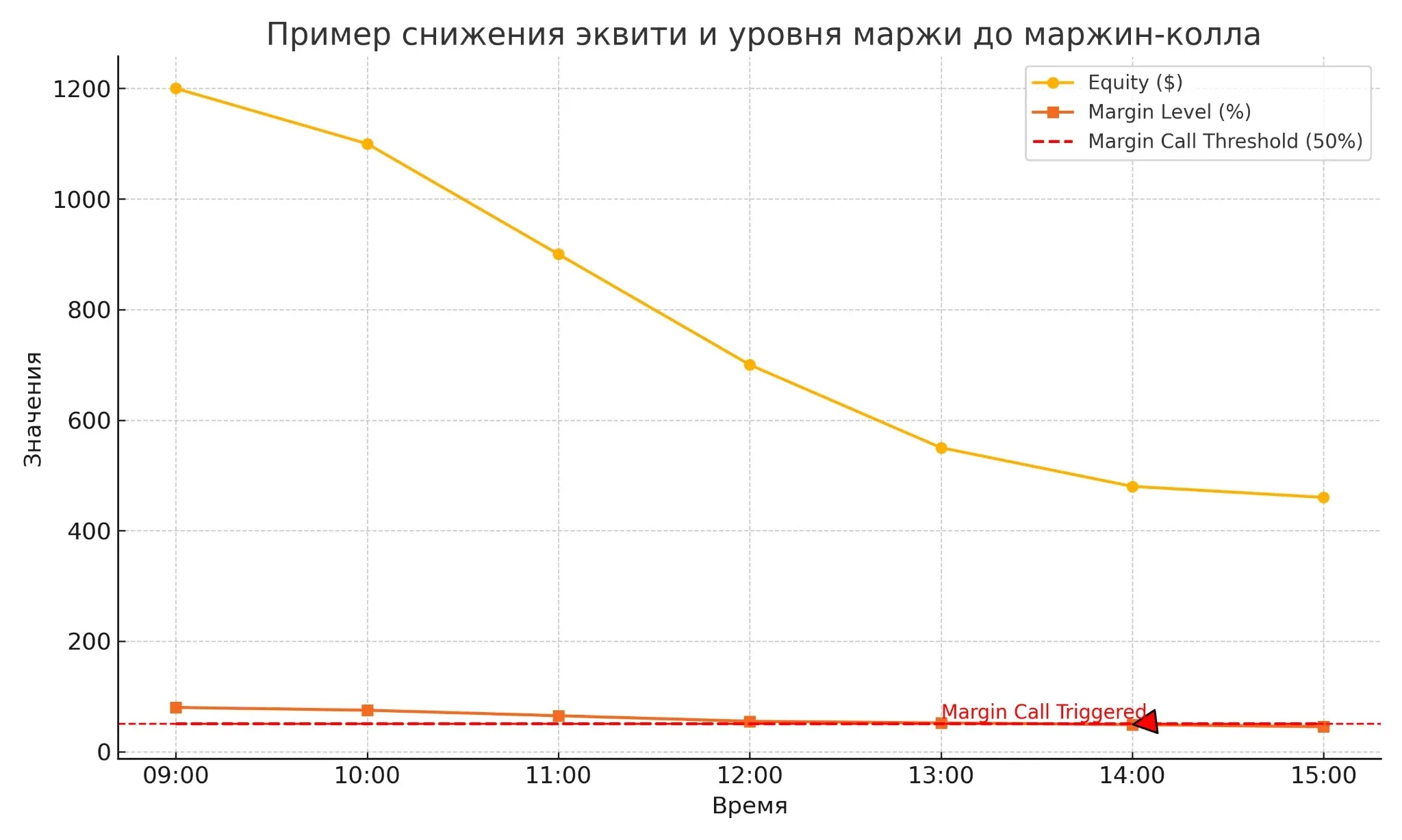 Пример: у тебя использовано $1000 маржи, но эквити уже $480 — бах, тебе «звонит» брокер.